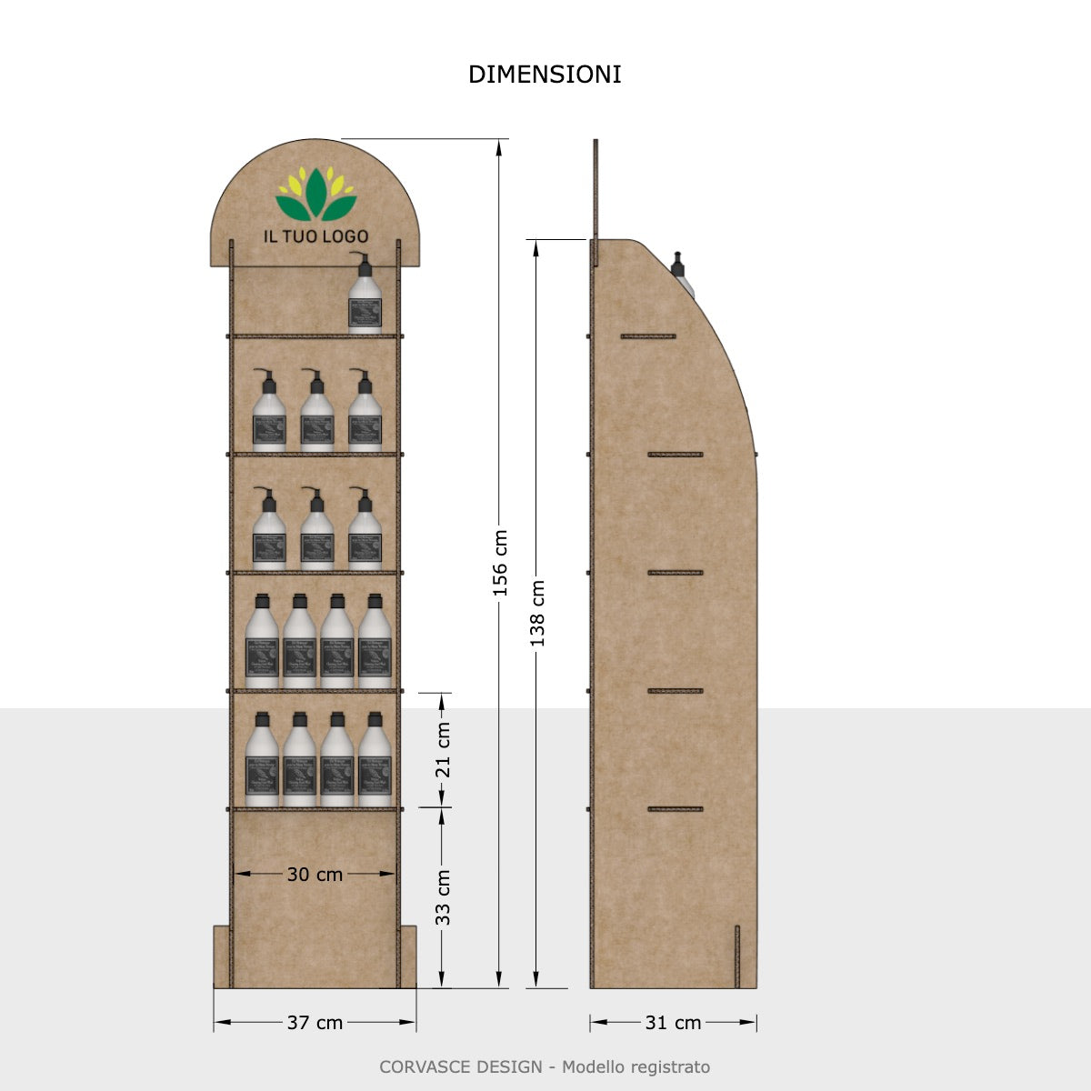 L’espositore Curcuma è composto da una struttura verticale a più ripiani studiata per massimizzare lo spazio espositivo in un ingombro ridotto. Ogni ripiano è robusto e pensato per sostenere il peso di svariati prodotti, mentre l'ampio crowner semicircolare offre una visibilità eccellente al tuo logo e al tuo messaggio promozionale.