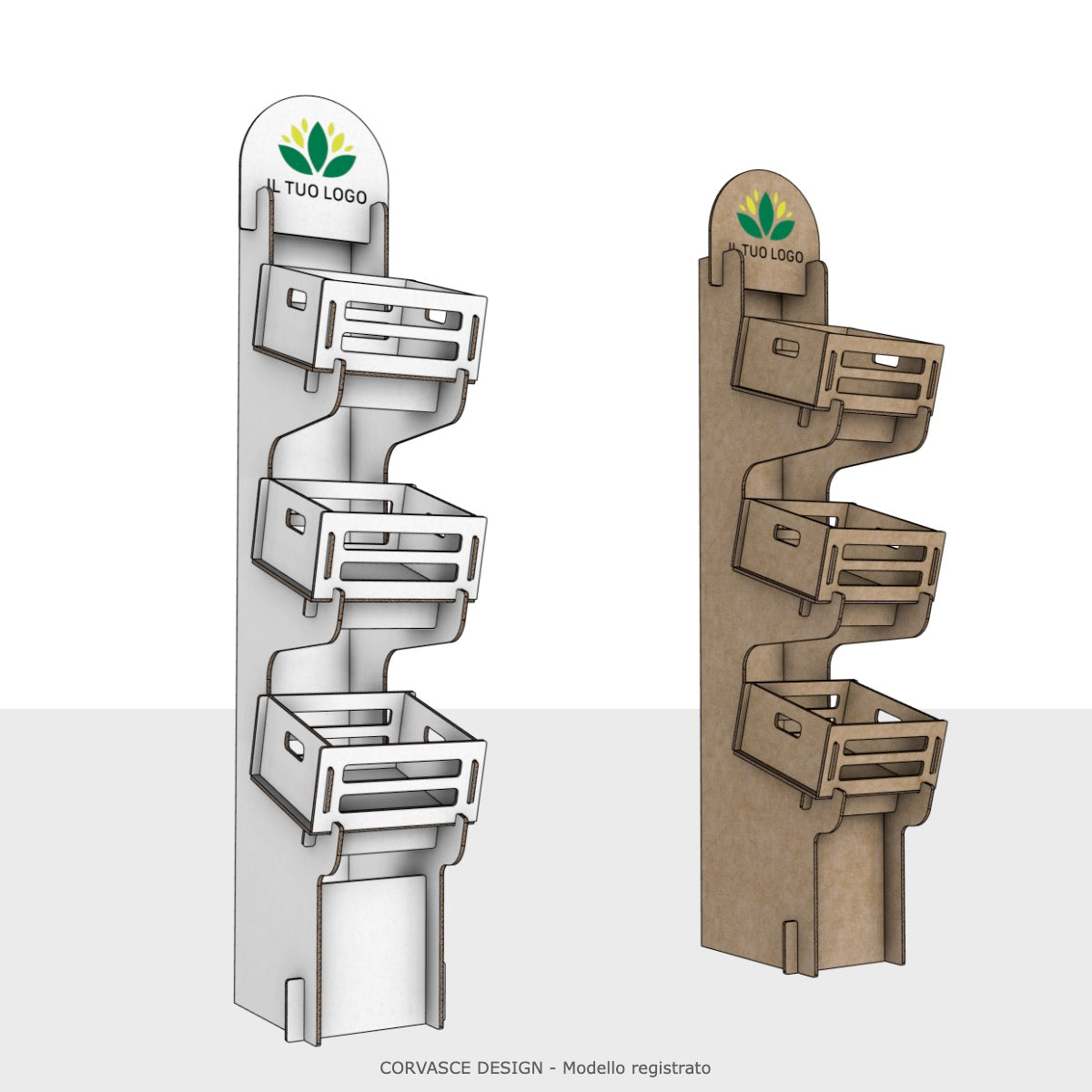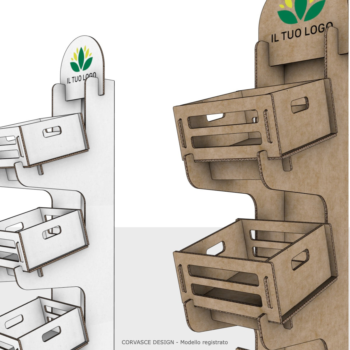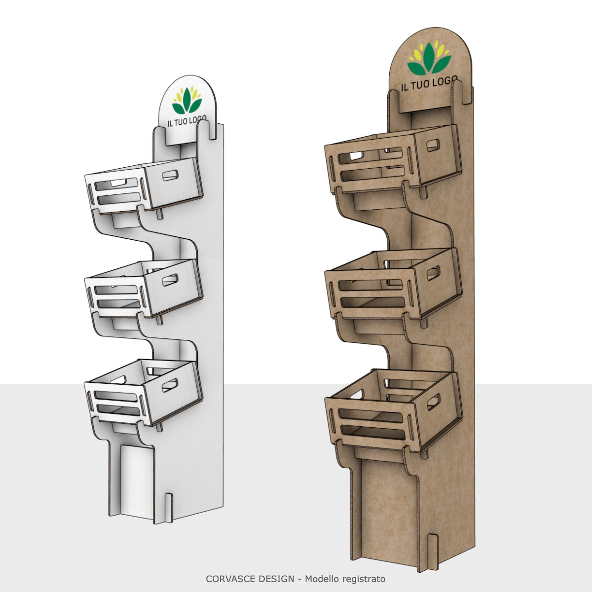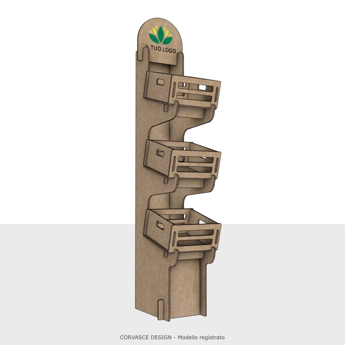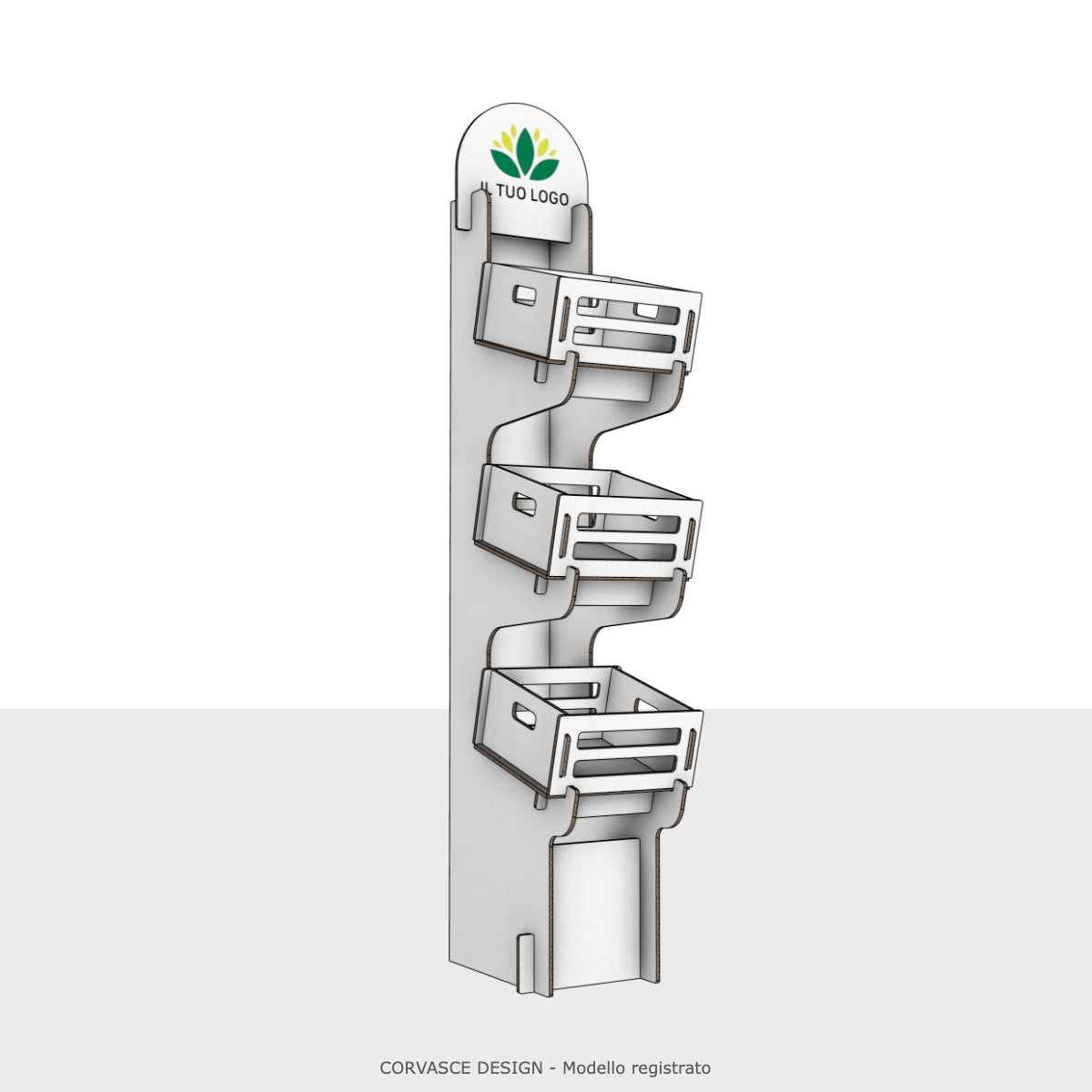 L'Espositore Oleandro è realizzato in cartone ondulato ad alta resistenza strutturale, dotato di 3 ceste frontali ad incastro inclinate per favorire la presa e la visibilità dei prodotti. Il pannello superiore è predisposto per la personalizzazione con logo tramite stampa diretta.